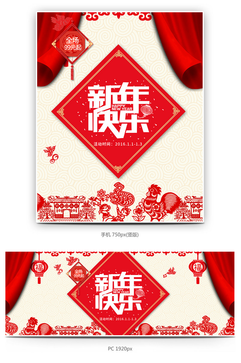90设计提供新年快乐喜庆全屏海报设计素材下载,高清PSD格式。【通用】多类目可用,产品、模特均可替换。【PSD】精细分层,贴好片。【设计】由90设计师独家设计。点击右侧免费下载按钮可进行新年快乐喜庆全屏海报淘宝设计素材高速下载。