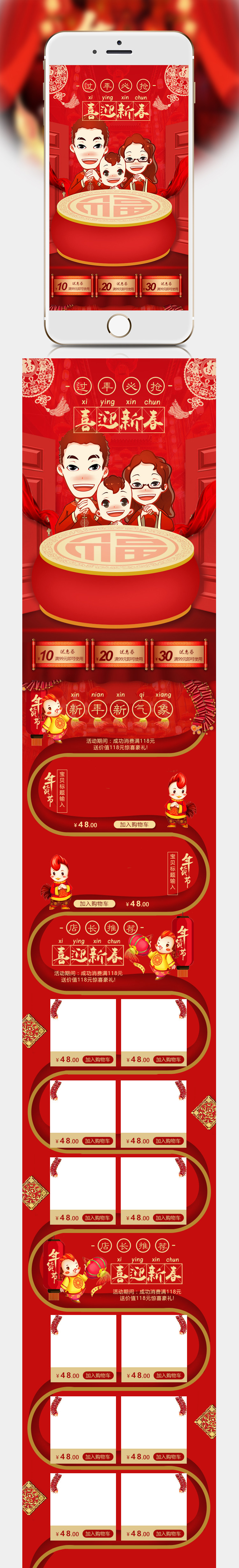 红色 喜庆 卡通 大鼓 卡通鸡 年货节 女装 皮衣 皮草 棉衣 羽绒服 外套 风衣 打底衫 无线端首页 模板 PSD