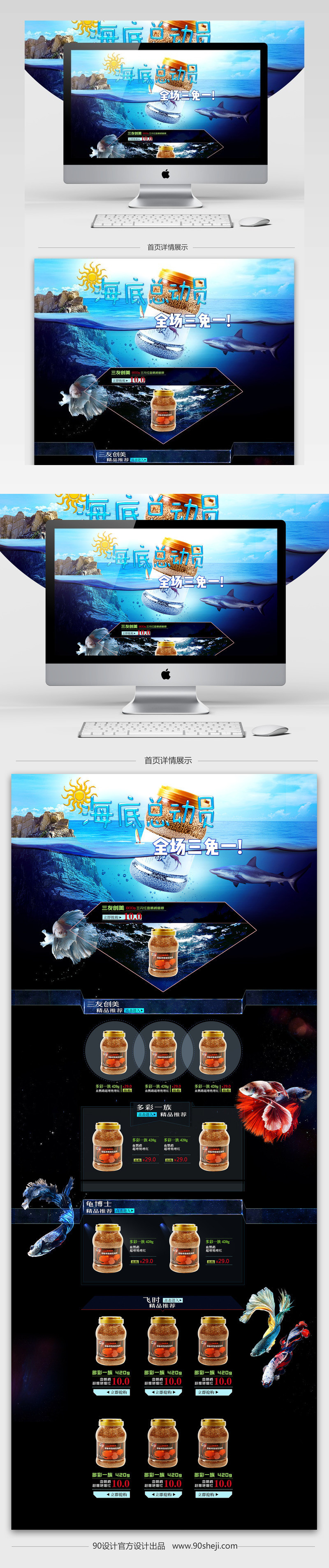 简约风 简洁风 淘宝 天猫 神秘风 深海 海面 鲨鱼 斗鱼 海底 鱼粮 龟粮 活动页 专题页 首页 专场 水族用品 促销 psd 圈圈