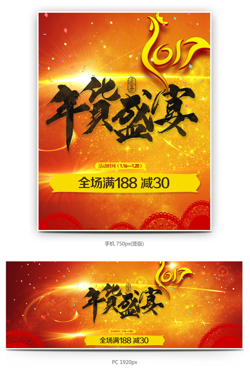 淘宝 喜庆 橘色 中国风 年货盛典 全屏海报 满减 光效 漂浮元素