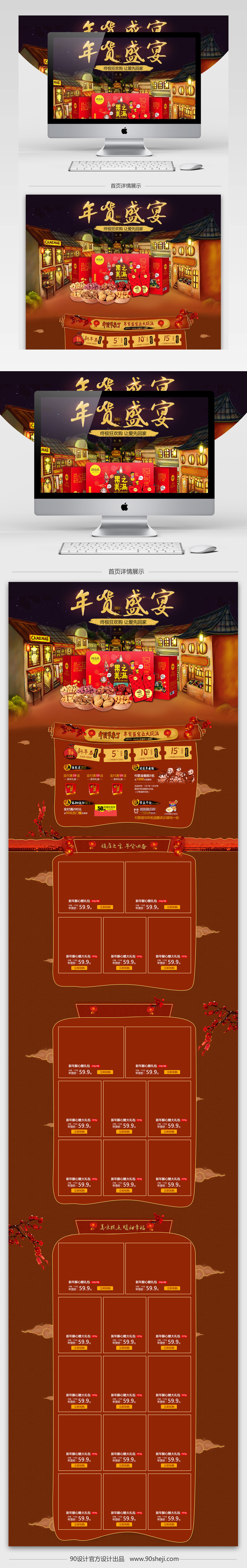 90设计提供炫酷风年货节零食促销店铺首页PSD模版设计素材下载,高清PSD格式。【通用】多类目可用,产品、模特均可替换。【PSD】精细分层,贴好片。【设计】由90设计师独家设计。点击右侧免费下载按钮可进行炫酷风年货节零食促销店铺首页PSD模版淘宝设计素材高速下载。