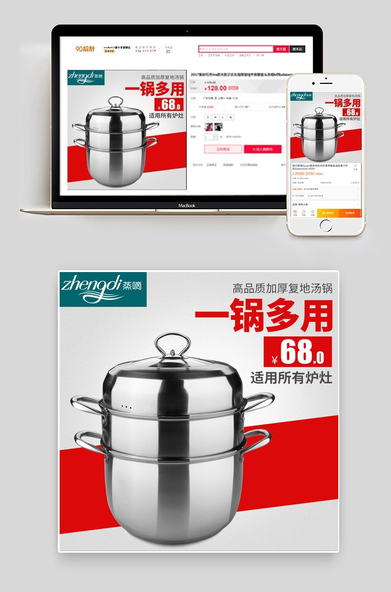 天猫 淘宝 蒸锅 煮锅 炖锅 灰色背景 红色背景 极简主义 一锅多用 厨具 主图 直通车 psd模板