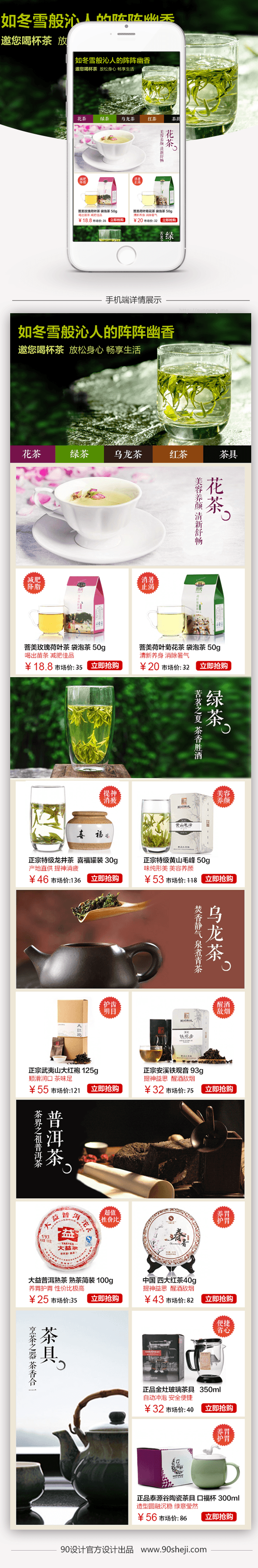 90设计提供清新自然风茶叶手机端首页模板psd设计素材下载,高清PSD格式。【通用】多类目可用,产品、模特均可替换。【PSD】精细分层,贴好片。【设计】由90设计师独家设计。点击右侧免费下载按钮可进行清新自然风茶叶手机端首页模板psd淘宝设计素材高速下载。
