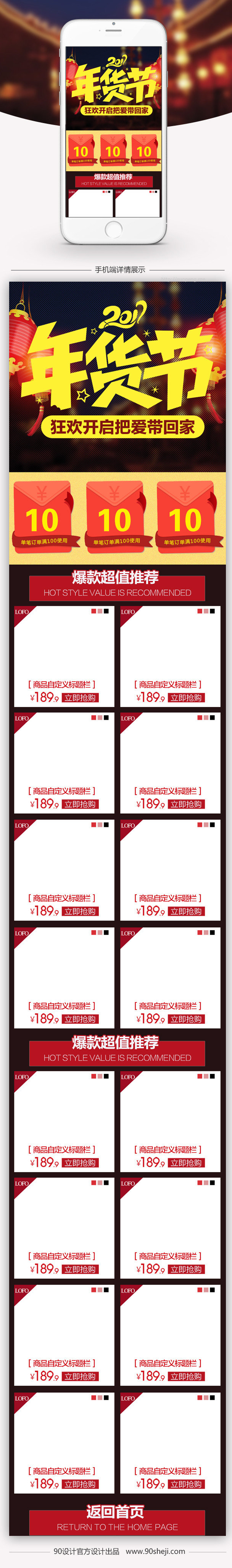 90设计提供喜庆中国风年货节电器手机端首页PSD模板设计素材下载,高清PSD格式。【通用】多类目可用,产品、模特均可替换。【PSD】精细分层,贴好片。【设计】由90设计师独家设计。点击右侧免费下载按钮可进行喜庆中国风年货节电器手机端首页PSD模板淘宝设计素材高速下载。