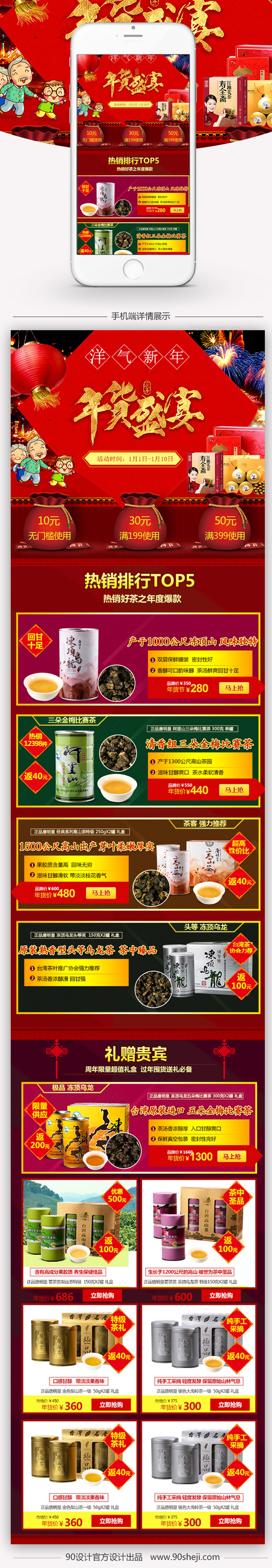 90设计提供红色喜庆卡通茶叶年货手机端首页psd设计素材下载,高清PSD格式。【通用】多类目可用,产品、模特均可替换。【PSD】精细分层,贴好片。【设计】由90设计师独家设计。点击右侧免费下载按钮可进行红色喜庆卡通茶叶年货手机端首页psd淘宝设计素材高速下载。