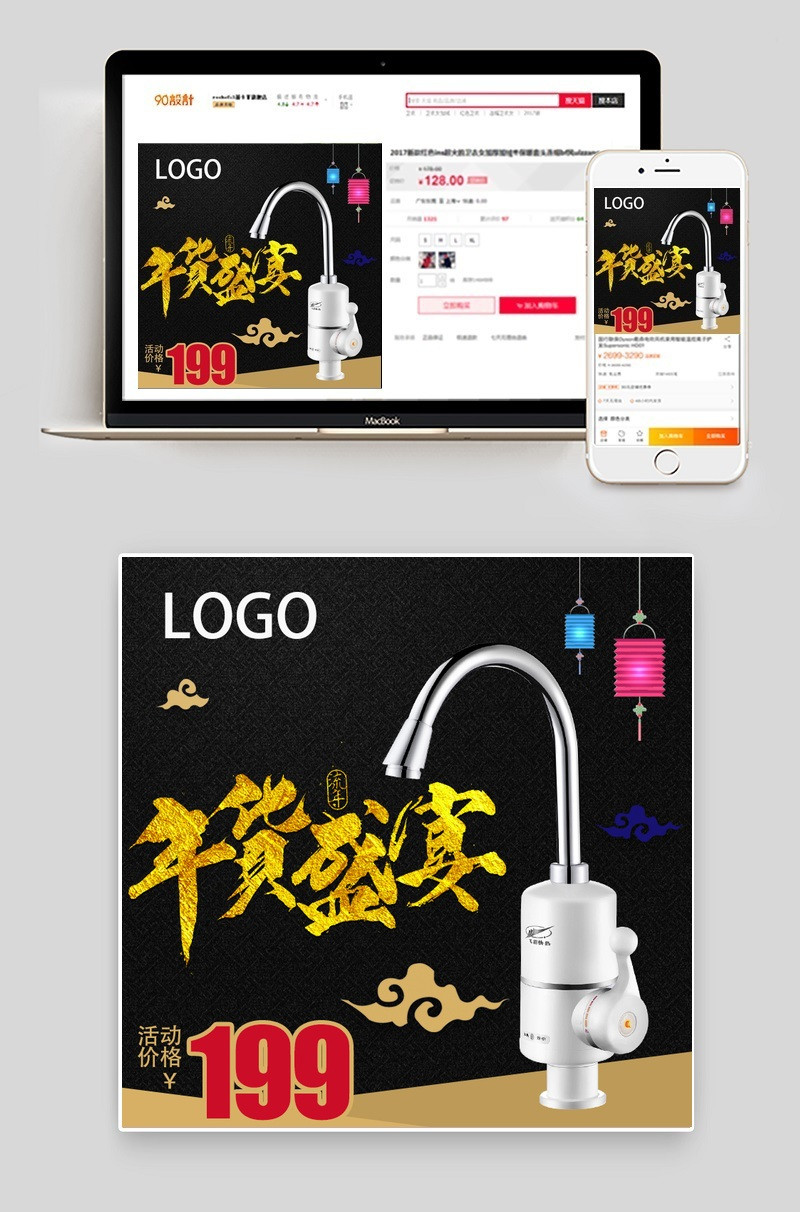 淘宝 天猫 京东 年货盛宴 热水器 水龙头主图 年货节 新年 直通车 主图 黑色背景 烤箱 微波炉 吸尘器 祥云 灯笼 中国风