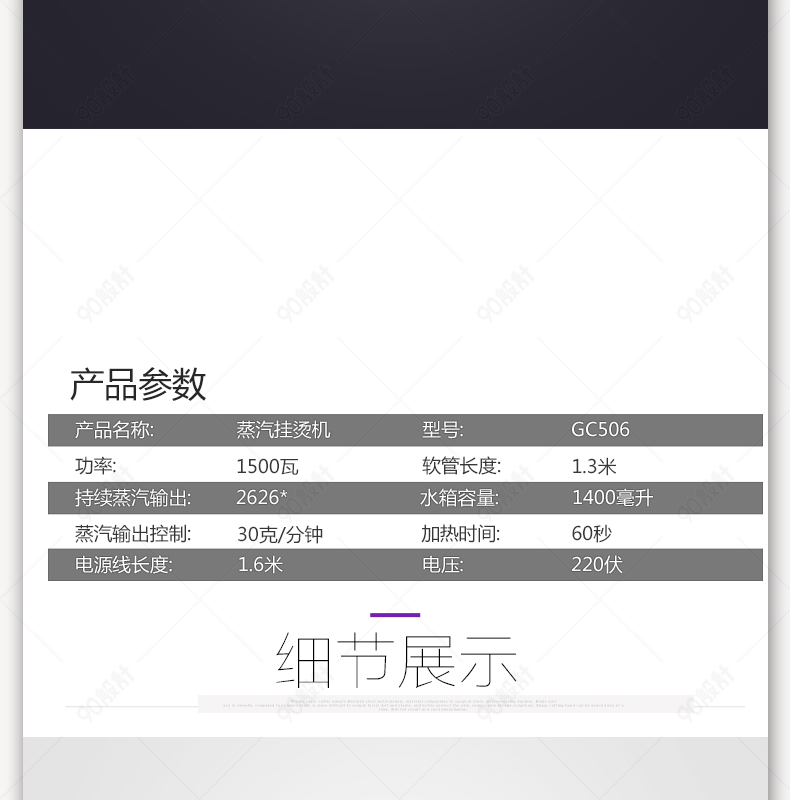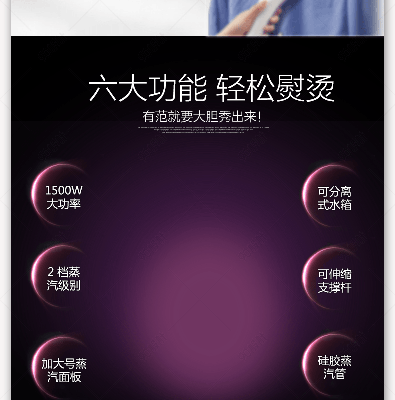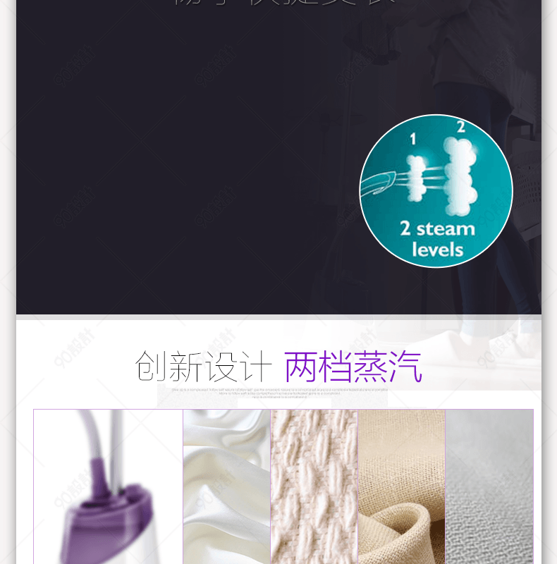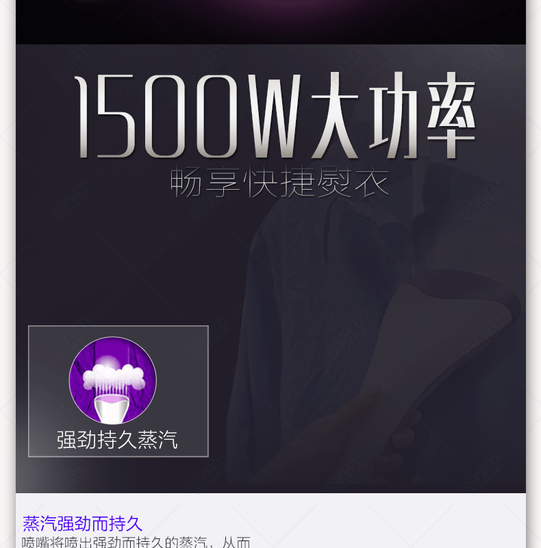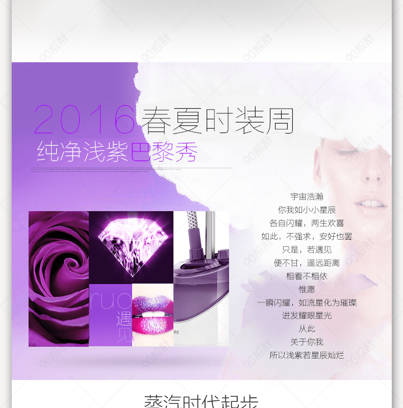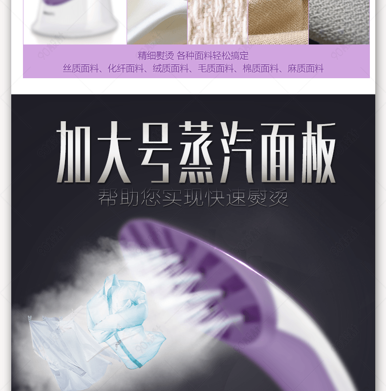 高端 生活电器详情页 挂烫机详情页 电熨斗 吸尘器 紫色背景 花朵 钻石 蒸汽 衬衣