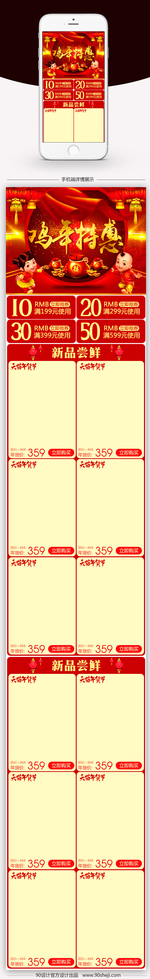 90设计提供红色喜庆数码无线端首页模板PSD设计素材下载,高清PSD格式。【通用】多类目可用,产品、模特均可替换。【PSD】精细分层,贴好片。【设计】由90设计师独家设计。点击右侧免费下载按钮可进行红色喜庆数码无线端首页模板PSD淘宝设计素材高速下载。