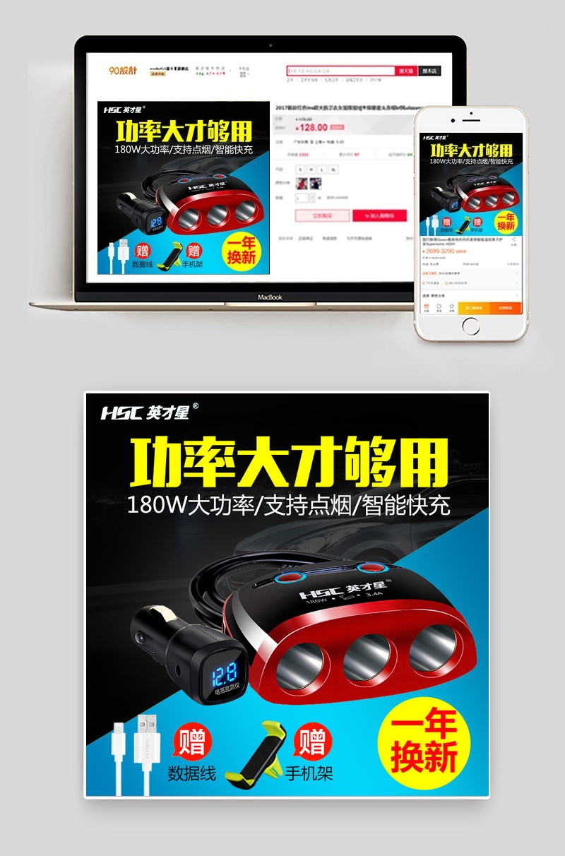 直通车 主图 汽车用品 汽车快速充电宝 手机数据线 手机架 黑色科技背景 炫酷 Aimeing