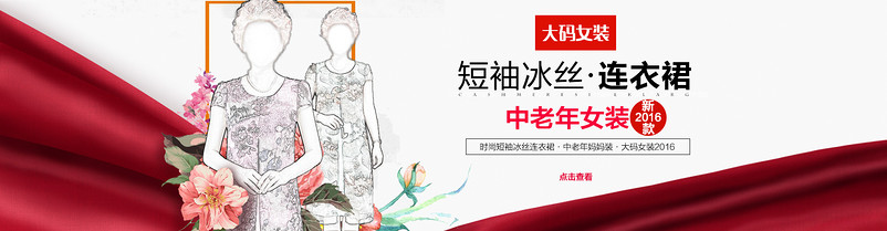 天猫 母亲节 时尚 简约 大码女装海报 妈妈装 连衣裙 真丝 雪纺 冰丝 短袖 红绸 花朵