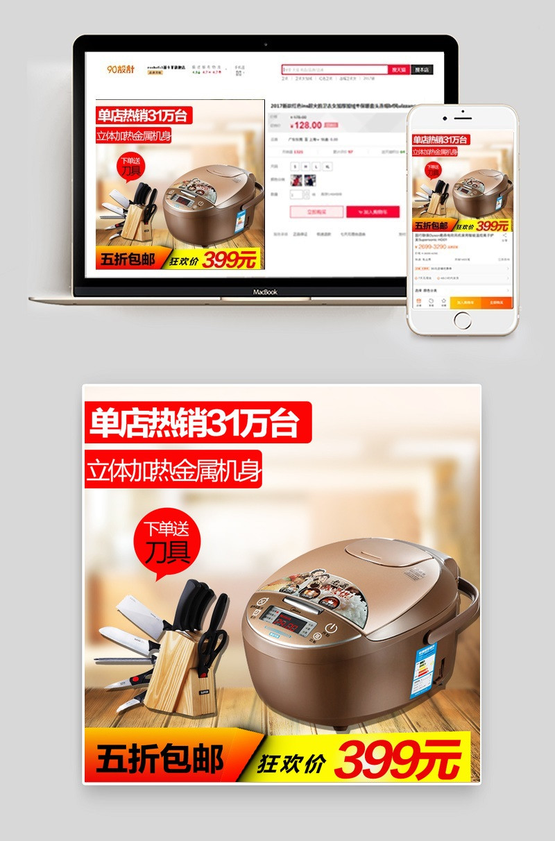 淘宝天猫 电器主图模板 电饭煲主图 直通车 电磁炉 榨汁机 平底锅 刀具 双十一电器促销模板 家居背景 简约风