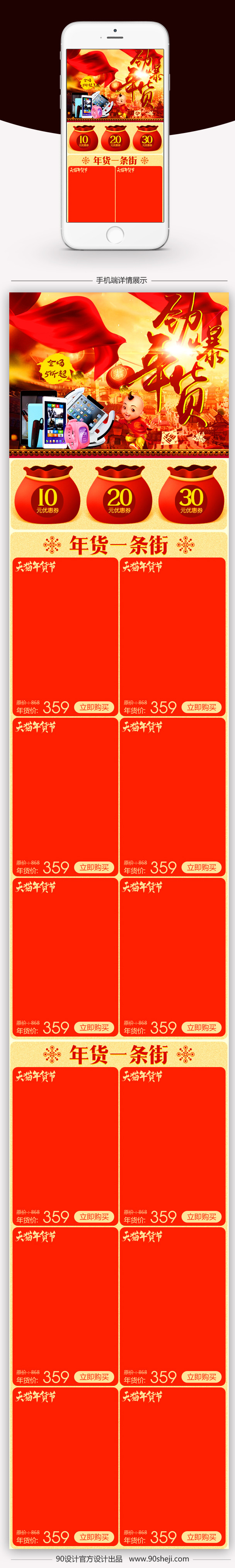90设计提供中国红家用电器无线端首页模板PSD设计素材下载,高清PSD格式。【通用】多类目可用,产品、模特均可替换。【PSD】精细分层,贴好片。【设计】由90设计师独家设计。点击右侧免费下载按钮可进行中国红家用电器无线端首页模板PSD淘宝设计素材高速下载。