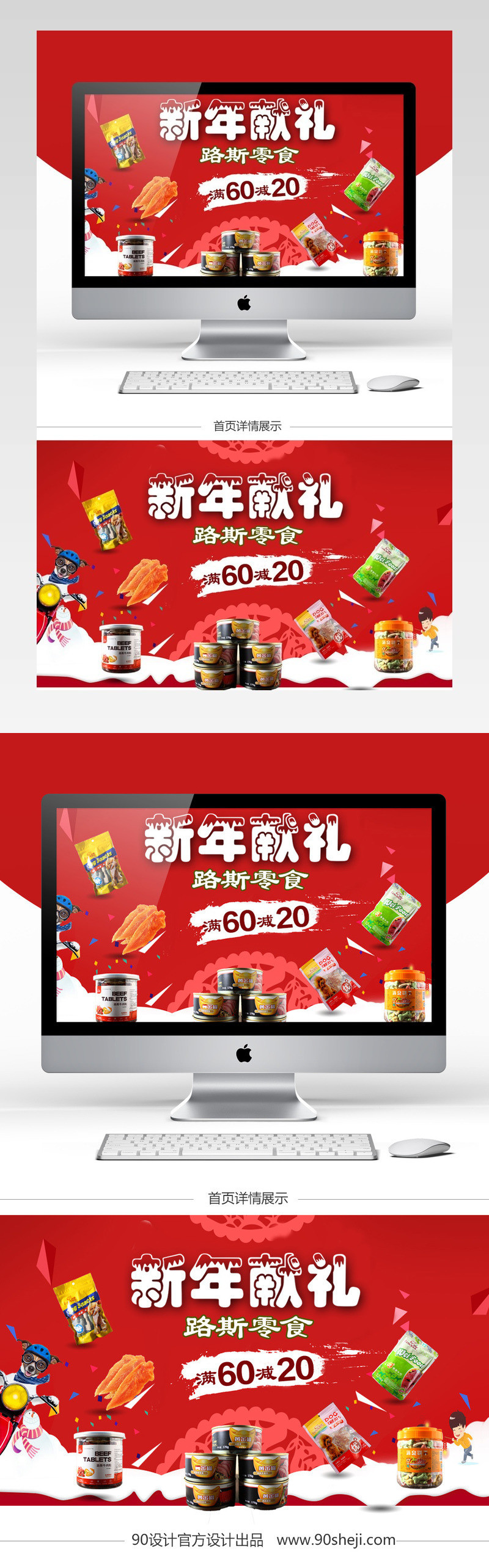 红色简约背景 新年促销 PC端店铺首页 通用模版 淘宝 电脑端 狗粮 新年钜惠 首页 海报 psd 婷停