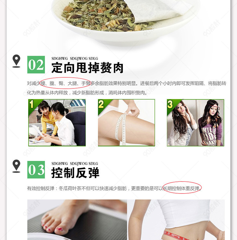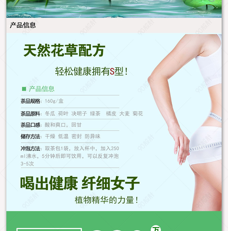 90设计提供淘宝天猫减肥茶冬瓜荷叶茶详情页设计素材下载,高清PSD格式。【通用】多类目可用,产品、模特均可替换。【PSD】精细分层,贴好片。【设计】由90设计师独家设计。点击右侧免费下载按钮可进行淘宝天猫减肥茶冬瓜荷叶茶详情页淘宝设计素材高速下载。