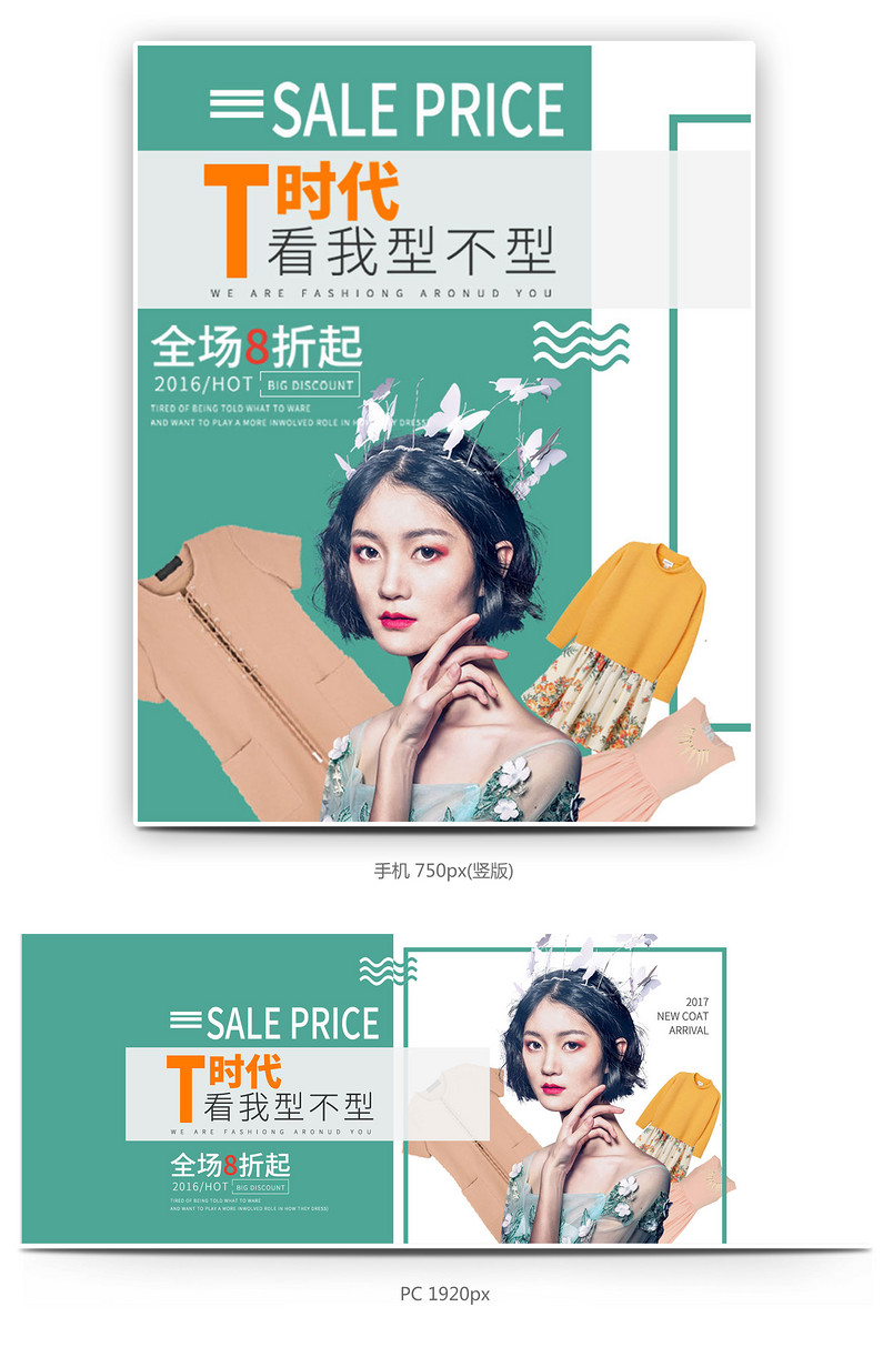 全屏海报 banner 海报 女装海报 女装 服装 绿色背景 春季女装 连衣裙 雪纺衫 衬衫 唯美风 简约风 小清新 淑女风 PSD模板 T时代 看我型不型 蓝色系列撞色