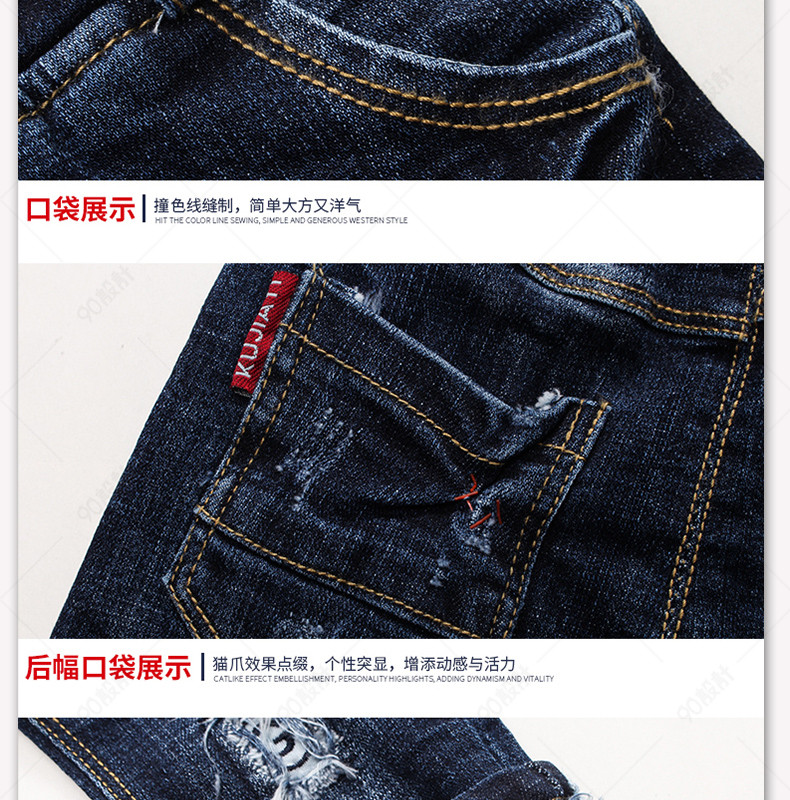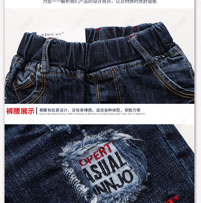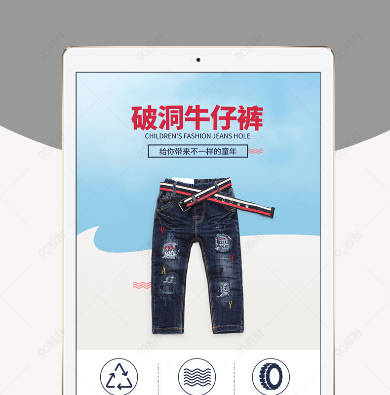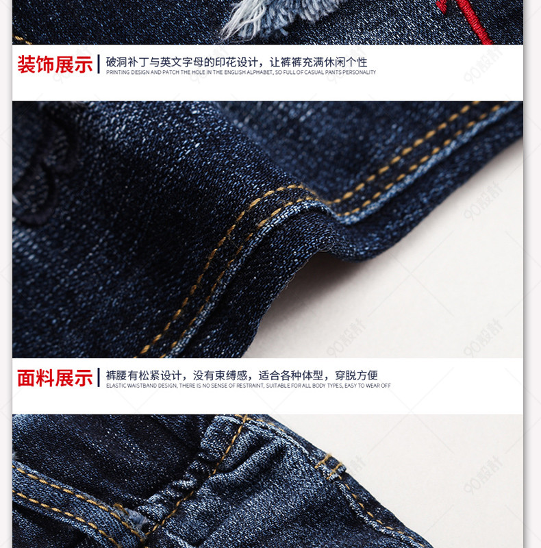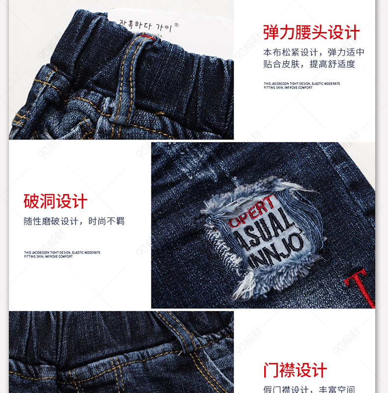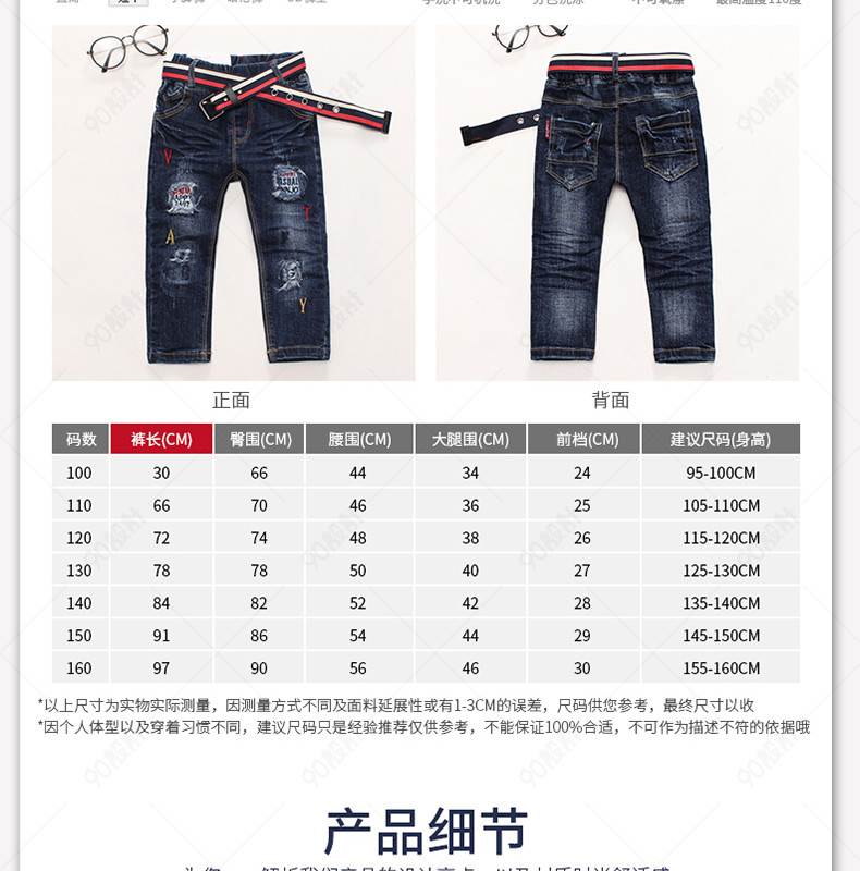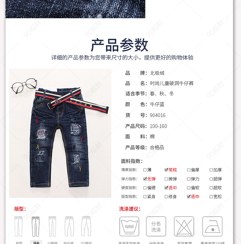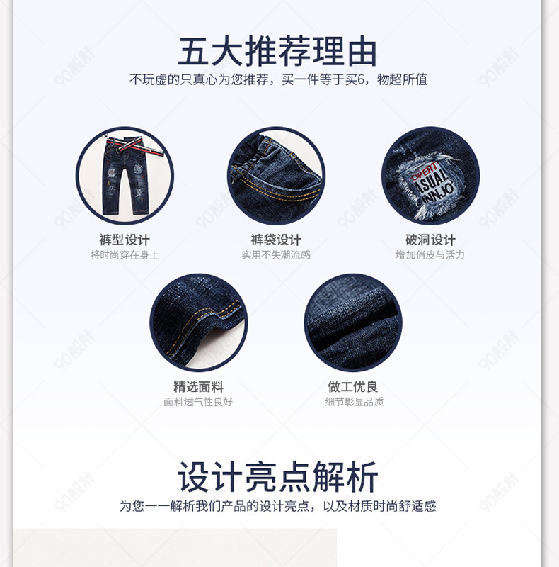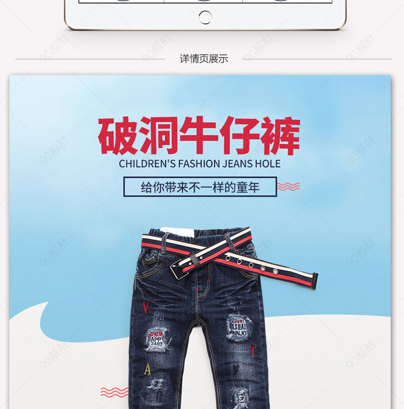 大气 时尚 童装 牛仔裤 裤子 休闲裤 蓝色背景 棉花 破洞 裤子细节 牛仔面料 男童