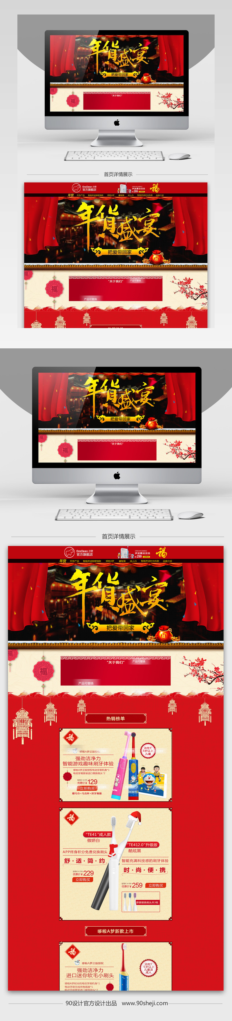 淘宝天猫中国风年货节电动牙刷首页PSD模板