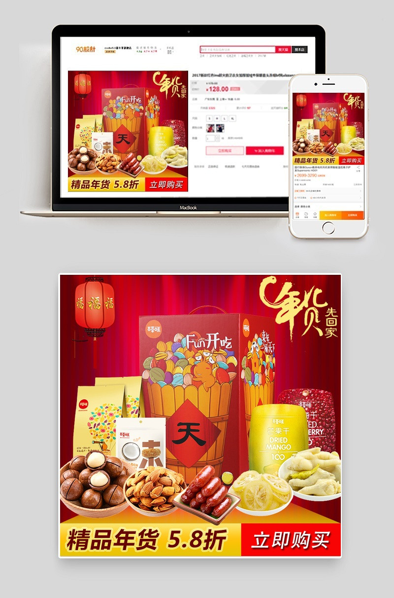 坚果 零食 主图 直通车 核桃 开心果 夏威夷果 碧根果 年货节 中国风 喜庆 红色 灯笼 绸缎