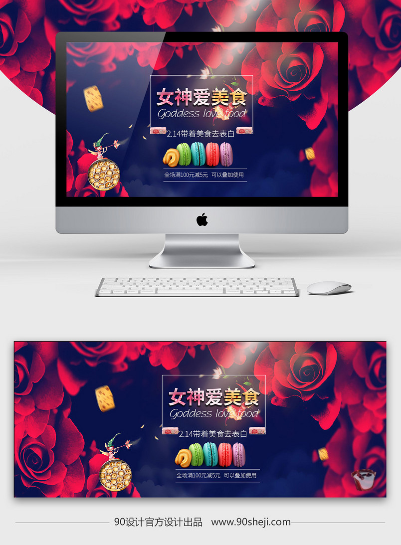 banner 促销 电商 食品小吃类海报 情人节海报 玫瑰花 女神节 女神爱美食 玫瑰花浪漫海报