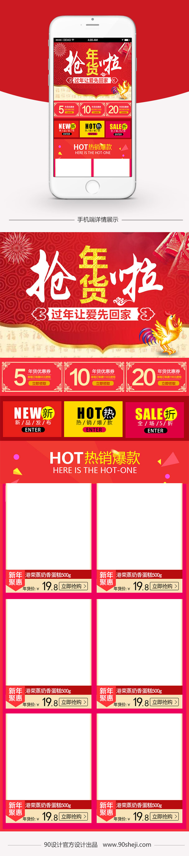 红色 喜庆 金鸡 年货 糕点 蛋糕 坚果 饼干 蛋黄派 进口食品 无线端首页 模板 PSD
