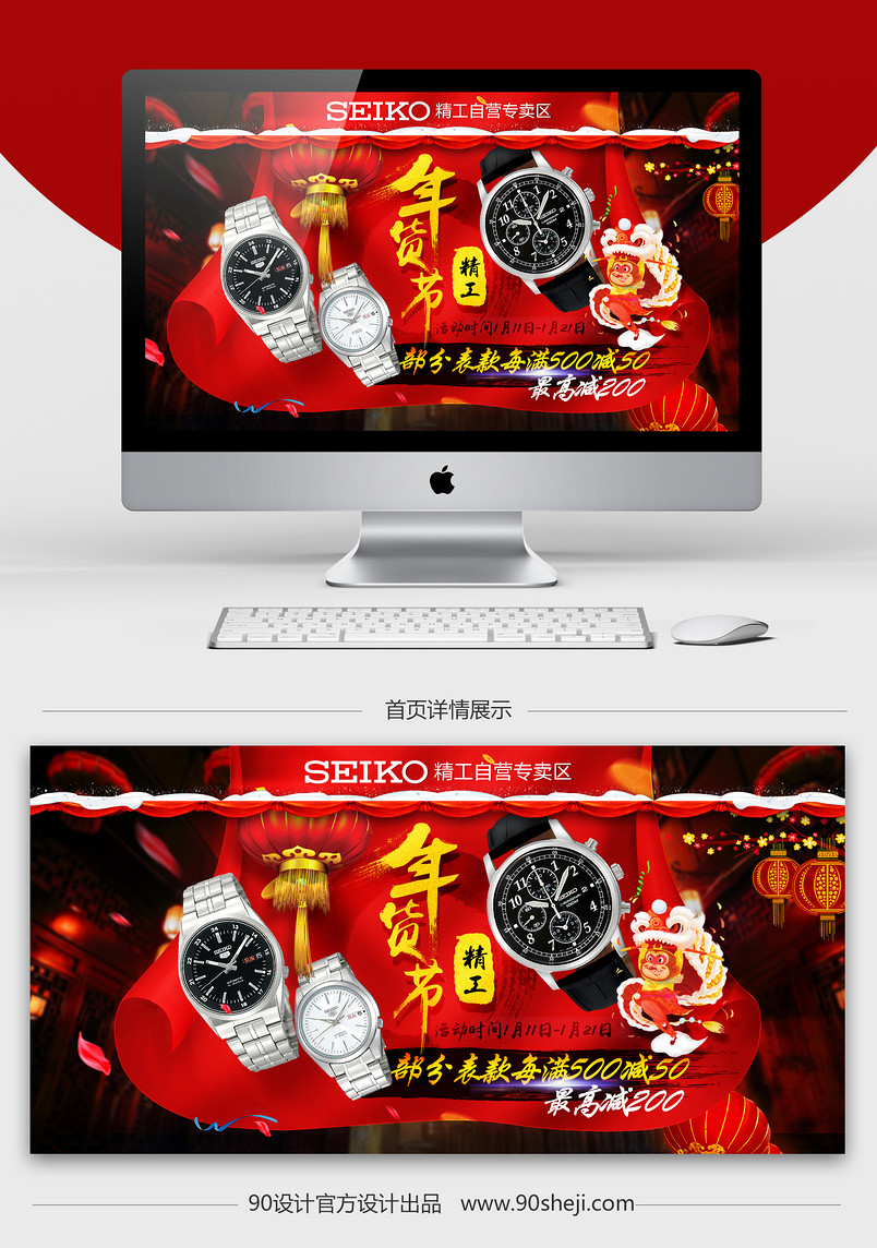 天猫 淘宝 喜庆 热闹 红色 新年 年货节 屯年货 鸡年 手表 钟表 banner 海报 年货节海报 新年喜庆海报