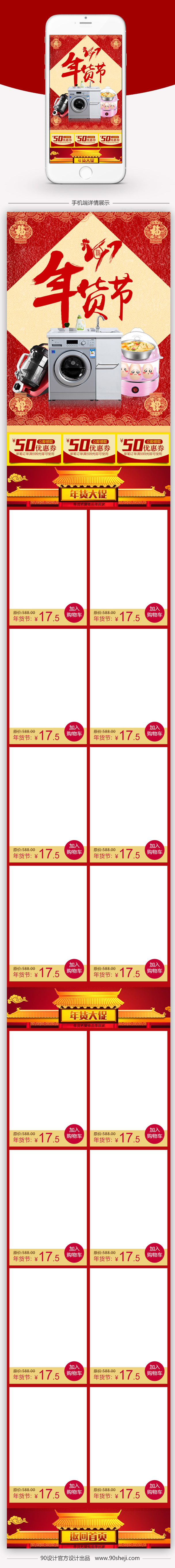 90设计提供红色喜庆年货节电器手机端首页PSD模板设计素材下载,高清PSD格式。【通用】多类目可用,产品、模特均可替换。【PSD】精细分层,贴好片。【设计】由90设计师独家设计。点击右侧免费下载按钮可进行红色喜庆年货节电器手机端首页PSD模板淘宝设计素材高速下载。