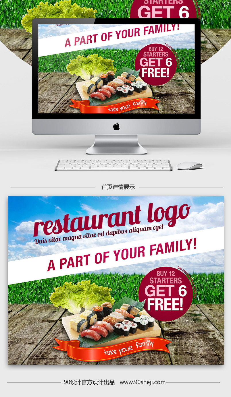 寿司 肉类 蔬菜 食材 生鲜 全屏海报 木板 草地背景 天空云朵 清爽 自然 田园风