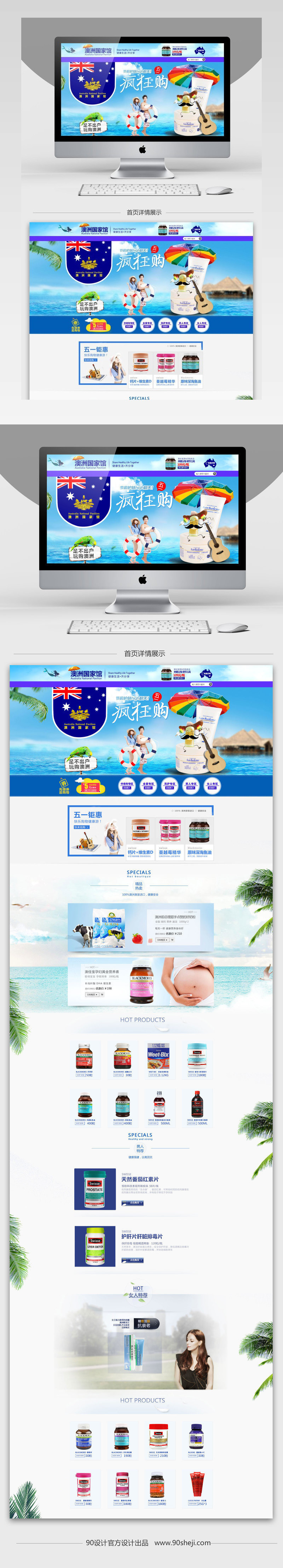 90设计提供疯狂购蓝色清新海洋风医药保健食品首页PSD模板设计素材下载,高清PSD格式。【通用】多类目可用,产品、模特均可替换。【PSD】精细分层,贴好片。【设计】由90设计师独家设计。点击右侧免费下载按钮可进行疯狂购蓝色清新海洋风医药保健食品首页PSD模板淘宝设计素材高速下载。