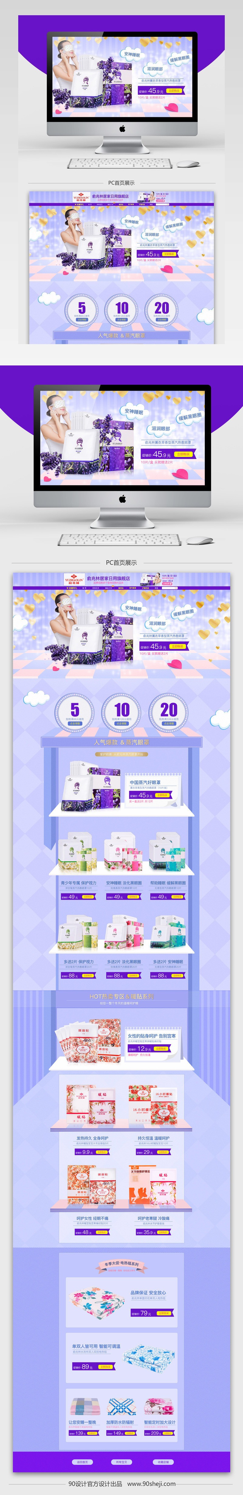 90设计提供唯美风家居日用百货蒸汽眼罩首页PSD模板设计素材下载,高清PSD格式。【通用】多类目可用,产品、模特均可替换。【PSD】精细分层,贴好片。【设计】由90设计师独家设计。点击右侧免费下载按钮可进行唯美风家居日用百货蒸汽眼罩首页PSD模板淘宝设计素材高速下载。