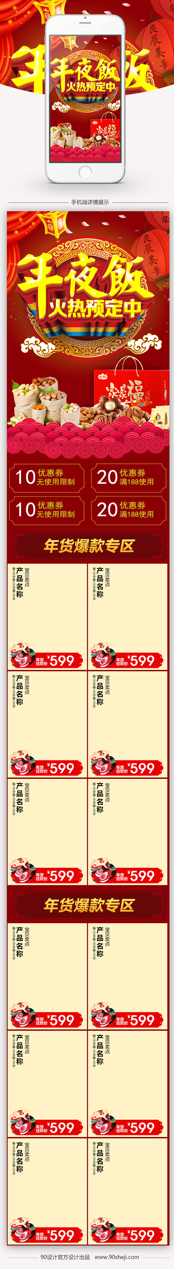 90设计提供喜庆中国风年货节零食手机端首页模板psd设计素材下载,高清PSD格式。【通用】多类目可用,产品、模特均可替换。【PSD】精细分层,贴好片。【设计】由90设计师独家设计。点击右侧免费下载按钮可进行喜庆中国风年货节零食手机端首页模板psd淘宝设计素材高速下载。