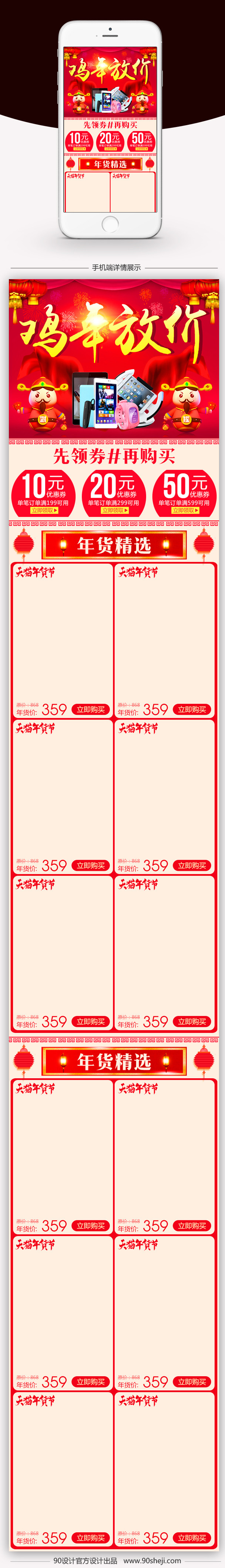 90设计提供红色喜庆年货节手机无线端首页模板PSD设计素材下载,高清PSD格式。【通用】多类目可用,产品、模特均可替换。【PSD】精细分层,贴好片。【设计】由90设计师独家设计。点击右侧免费下载按钮可进行红色喜庆年货节手机无线端首页模板PSD淘宝设计素材高速下载。