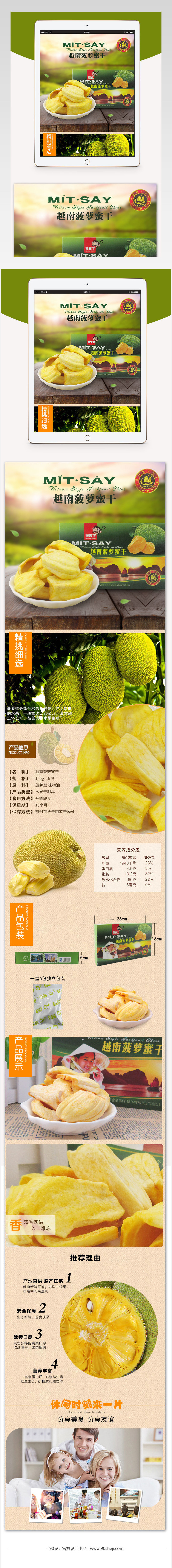食品菠萝蜜干详情页 菠萝干 零食 小吃 简约唯美风格 越南 小清新 食物 花纹背景