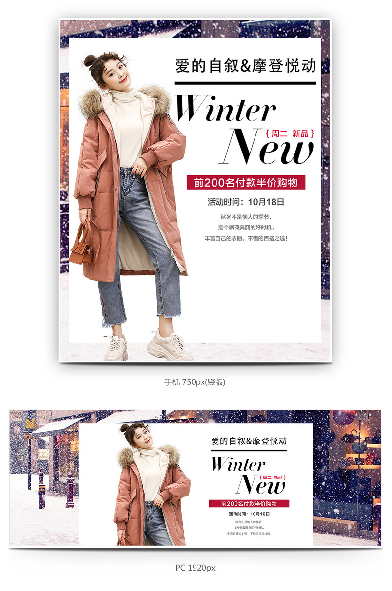 全屏海报 banner 海报 女装海报 冬季女装 唯美风 简约风 雪景背景 实拍背景 女装 羽绒 棉衣 针织衫 女装首页模板 连衣裙首页模板 大衣首页全屏模板 长裙 衬衫 背带裤 文艺框 线条 简约风格