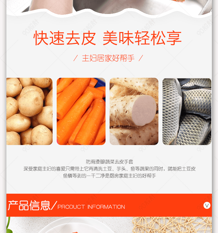 90设计提供淘宝厨具家用厨房蔬菜去皮手套详情页PSD模板设计素材下载,高清PSD格式。【通用】多类目可用,产品、模特均可替换。【PSD】精细分层,贴好片。【设计】由90设计师独家设计。点击右侧免费下载按钮可进行淘宝厨具家用厨房蔬菜去皮手套详情页PSD模板淘宝设计素材高速下载。