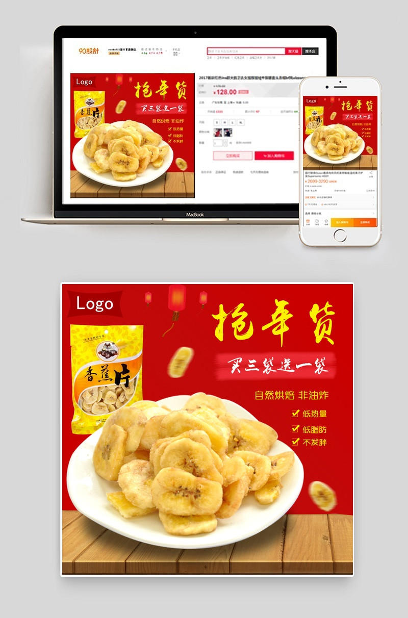 年货节中国风零食香蕉皮片主图PSD模板