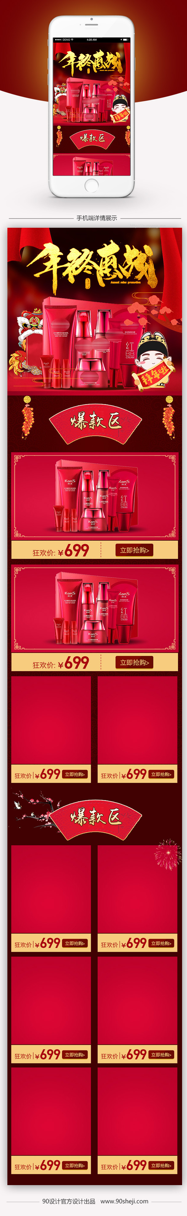 90设计提供喜庆中国风年货节化妆品无线端首页模板PSD设计素材下载,高清PSD格式。【通用】多类目可用,产品、模特均可替换。【PSD】精细分层,贴好片。【设计】由90设计师独家设计。点击右侧免费下载按钮可进行喜庆中国风年货节化妆品无线端首页模板PSD淘宝设计素材高速下载。