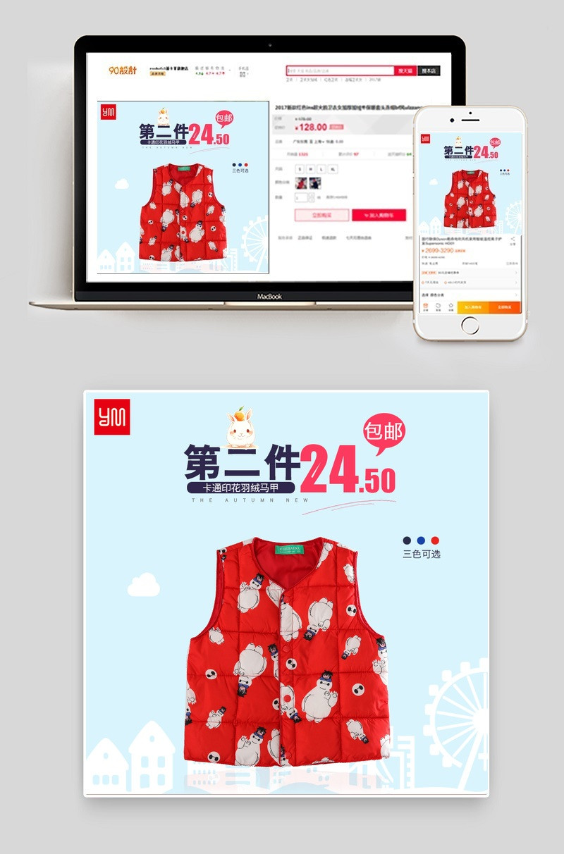 淡蓝色卡通简约童装羽绒马甲直通车主图psd模板