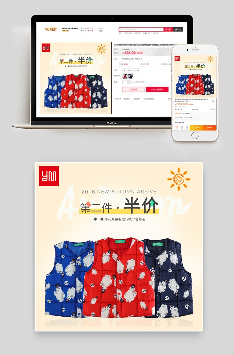 淡黄色简约风童装羽绒马甲主图直通车psd模板