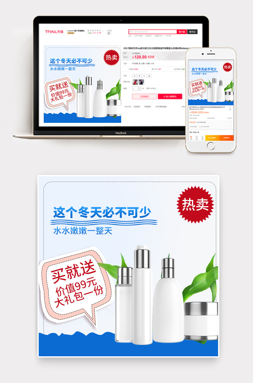 简约 简洁 清新 美妆 化妆品 主图 爽肤水 面霜 洁面奶 绿叶 对话框