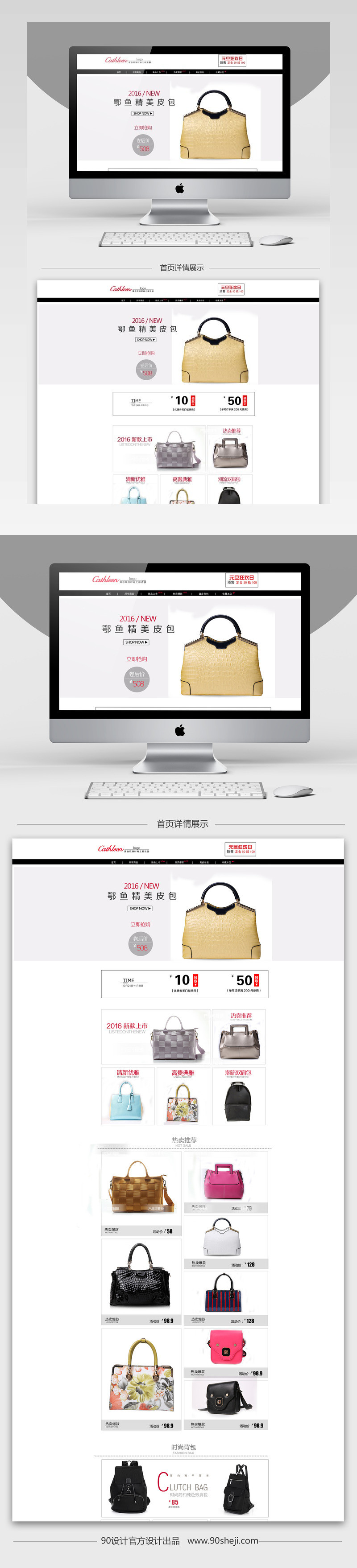 90设计提供包包PC端首页模板PSD设计素材下载,高清PSD格式。【通用】多类目可用,产品、模特均可替换。【PSD】精细分层,贴好片。【设计】由90设计师独家设计。点击右侧免费下载按钮可进行包包PC端首页模板PSD淘宝设计素材高速下载。