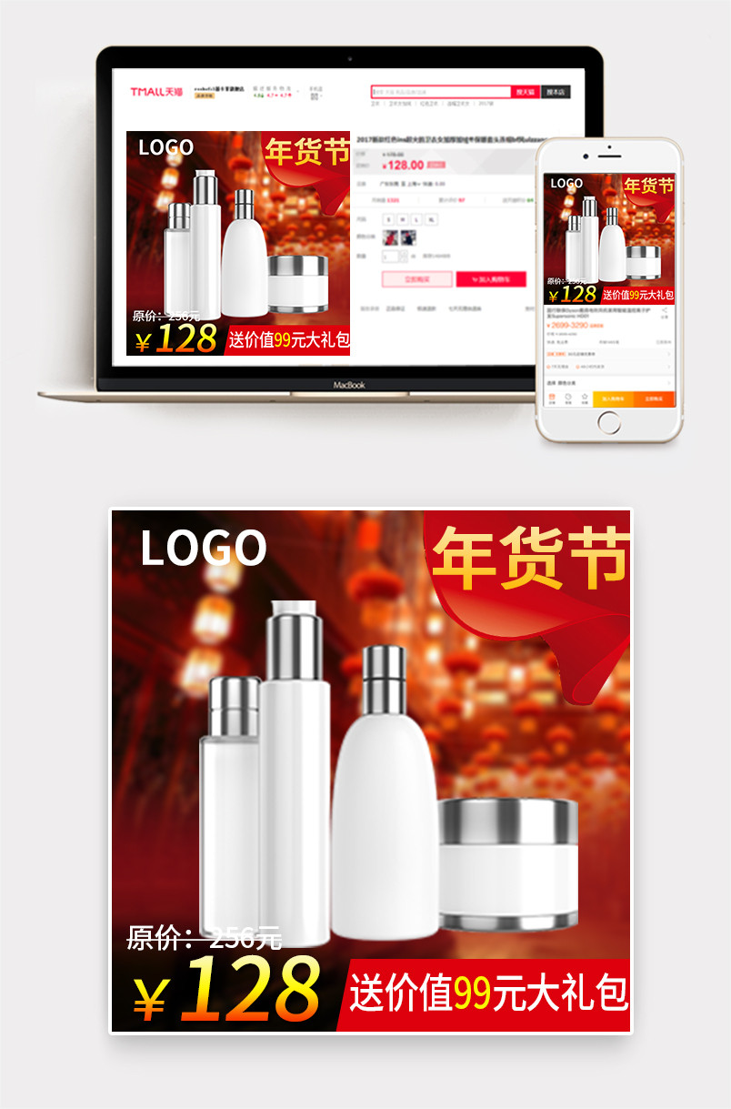 中国风 大气 美妆主图 护肤品主图 化妆品套装主图 直通车 淘宝 天猫 主图 直通车 化妆品 美妆 红色 喜庆 腊八 年货节