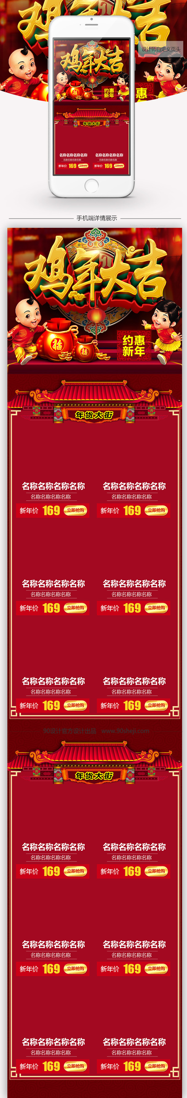 红色 喜庆 福娃 钱袋 屋檐 鸡年大吉 零食无线端 坚果 饼干 糕点 饮料 巧克力 进口食品 无线端首页 模板 PSD