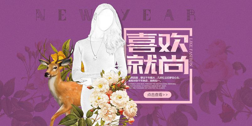 淘宝 天猫 简约 时尚 大气 女装海报 卫衣 毛衣 针织衫海报 复古花朵叶子装饰 梅花鹿