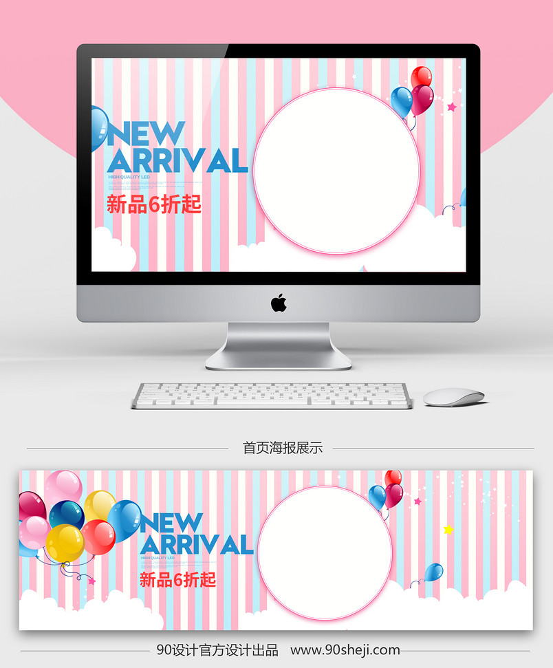 全屏海报 banner 海报 女装海报 甜美风 时尚女装 T恤 卫衣 牛仔裤 针织衫 粉色 条纹背景 气球素材