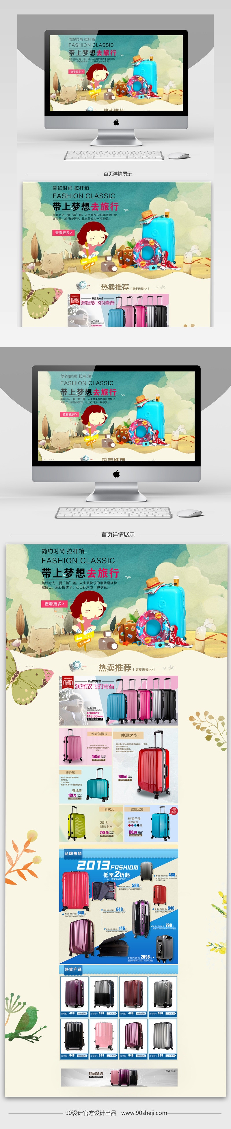 箱包 PC端首页 店铺首页 首页装修 箱包首页 卡通背景 唯美风 甜美风 拉杆箱 行李箱 旅行箱