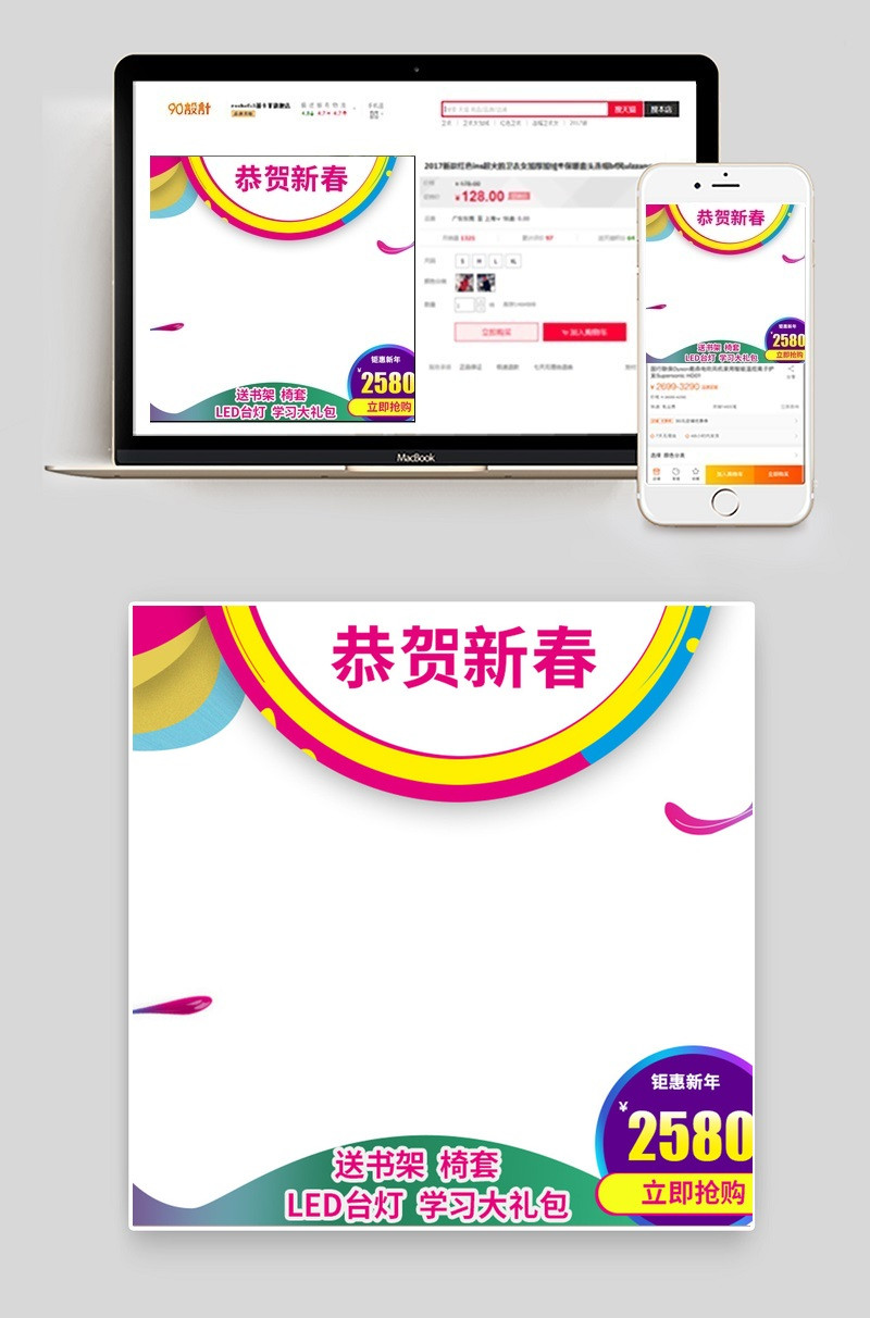 小清新白色背景 淘宝 天猫 春节 恭贺新春 彩色色块 主图 直通车psd