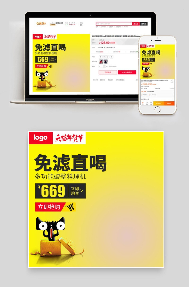 年货节破壁机生活电器黄色促销直通车主图PSD模板