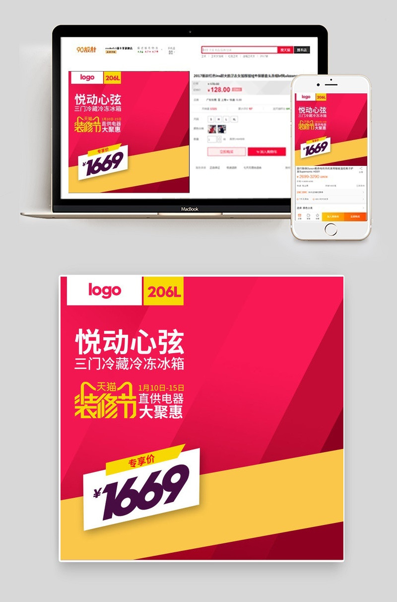 天猫装修节 简约时尚 家电主图背景 红色 电器 数码 冰箱主图 三门冷藏 冷冻冰箱 直供电器 大聚惠