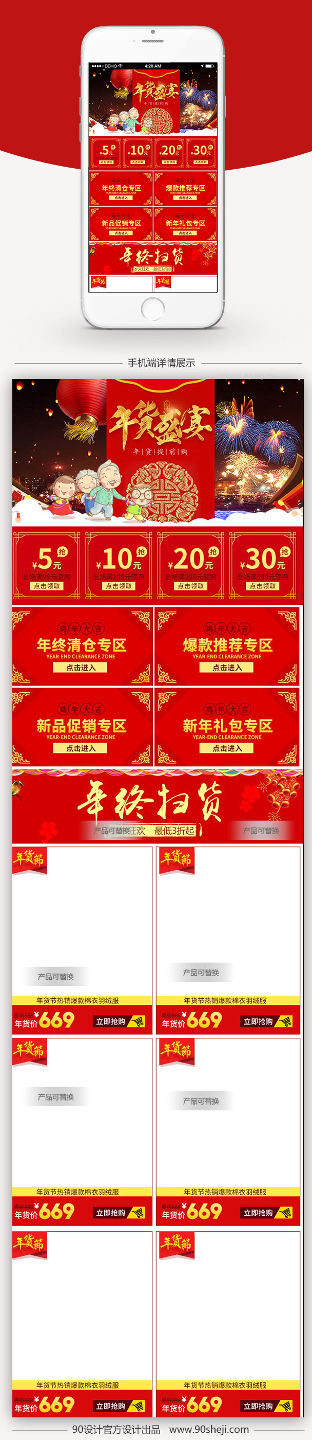 90设计提供红色喜庆女装年货节无线端首页模板PSD设计素材下载,高清PSD格式。【通用】多类目可用,产品、模特均可替换。【PSD】精细分层,贴好片。【设计】由90设计师独家设计。点击右侧免费下载按钮可进行红色喜庆女装年货节无线端首页模板PSD淘宝设计素材高速下载。