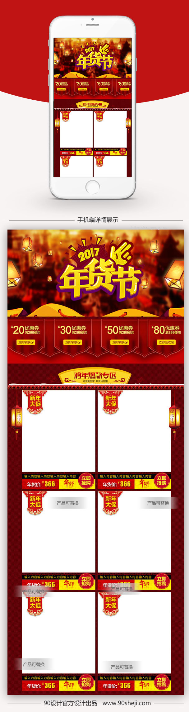 90设计提供红色喜庆女装年货节无线端首页模板PSD设计素材下载,高清PSD格式。【通用】多类目可用,产品、模特均可替换。【PSD】精细分层,贴好片。【设计】由90设计师独家设计。点击右侧免费下载按钮可进行红色喜庆女装年货节无线端首页模板PSD淘宝设计素材高速下载。